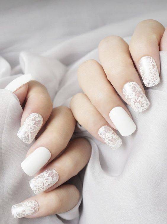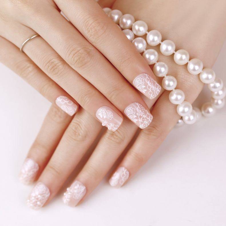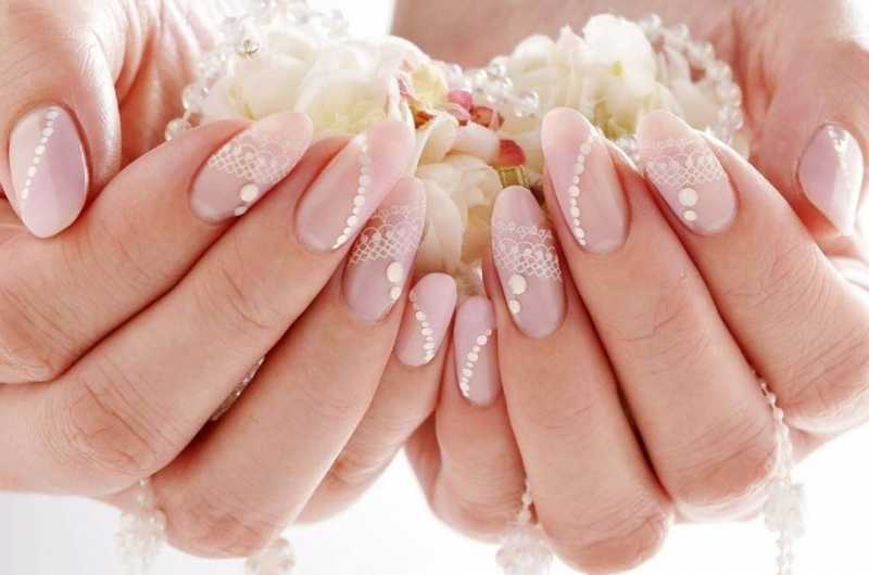 Кружевные узоры – самые популярные и востребованные в свадебном нейл-арте. Воздушное кружево добавит образу невесты легкости, женственности и благородства. Такой маникюр отлично сочетается с свадебным платьем и фатой. Существует две основных техники выполнения кружевного маникюра: