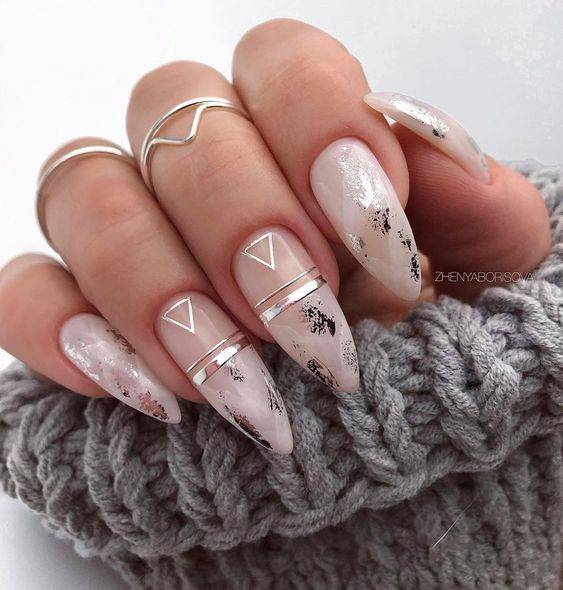 Блестящий маникюр с геометрическими фигурами и рисунками