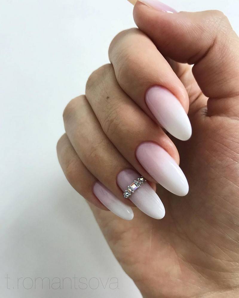 Изысканный розовый воплощает всегда любовь и нежность. Поэтому розовые оттенки одни из самых популярных в свадебном маникюре. Градиент и амбре розового с белым – на высших позициях в рекомендациях стилистов на 2020 год. Розовый маникюр будет выигрышно смотреться на округлых и натуральных формах ногтевой пластины. Он совершенно не подойдет к квадратным или острым формам.