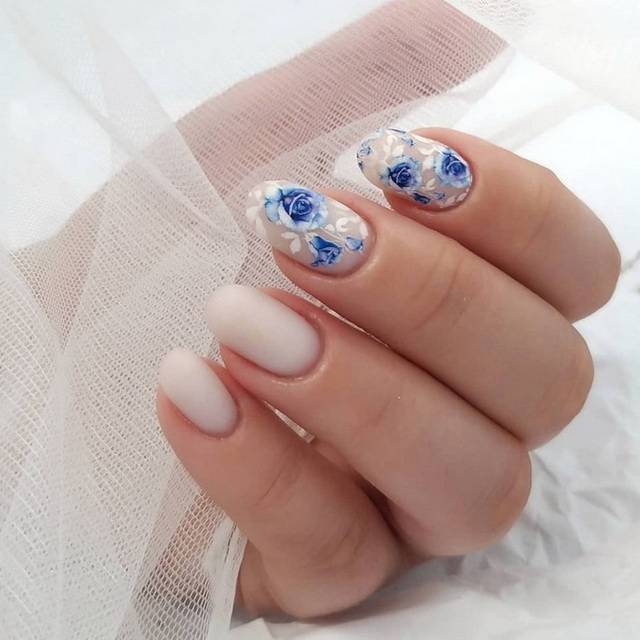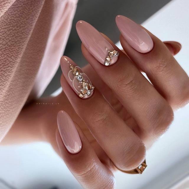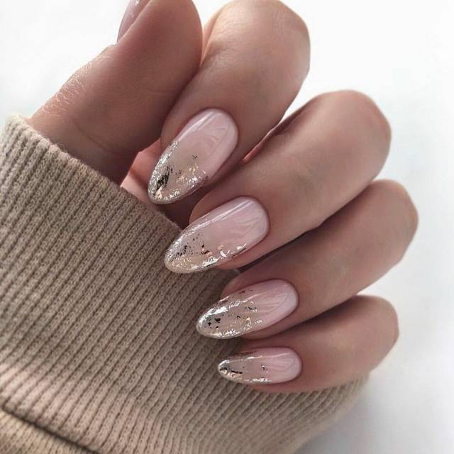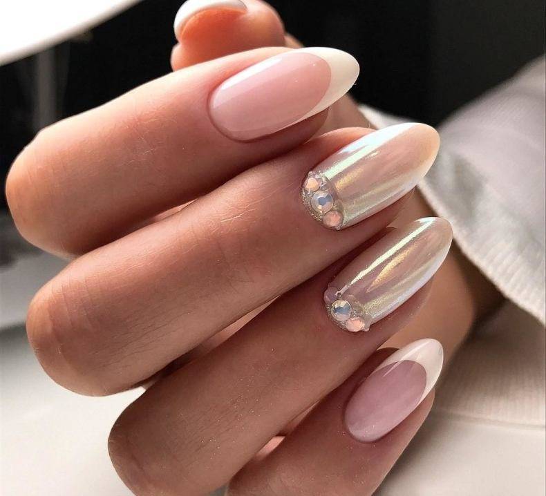 Особенно эстетично смотрятся ногти невесты самой мягкой овальной или миндалевидной формы. Для украшения такой подойдет все – от нежной жемчужной втирки до лунного маникюра на нюдовой основе. Также очень здорово выглядят овальные ногти молочного цвета с легким намеком на прозрачность и самый мелкий блестящий шиммер с минимальным количеством и плотностью блесток.