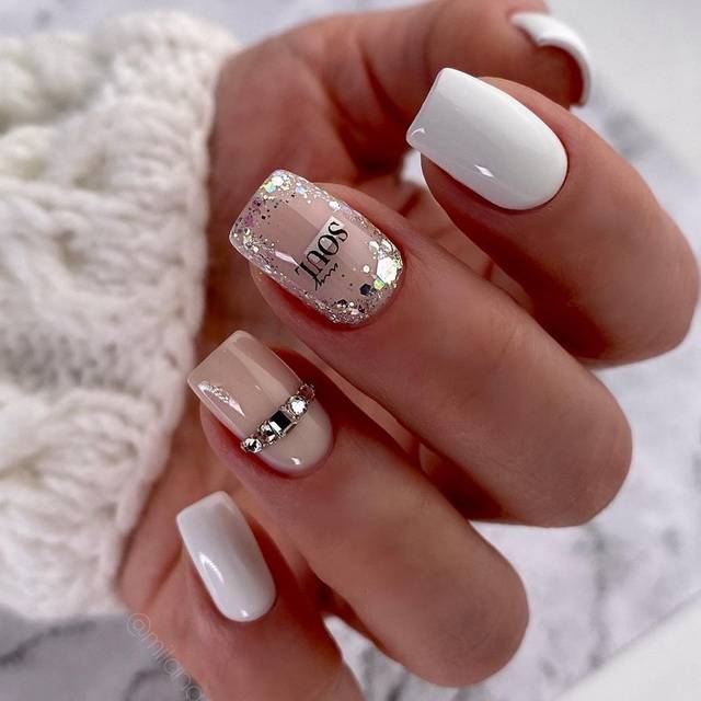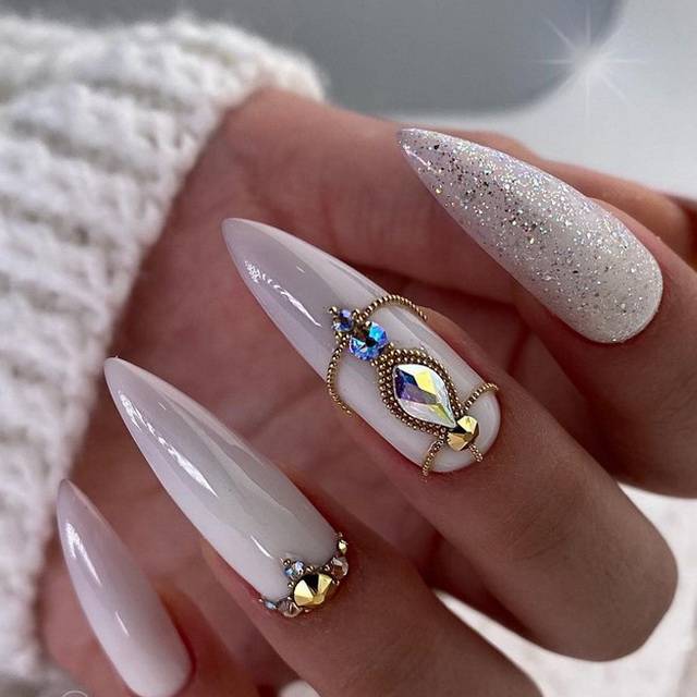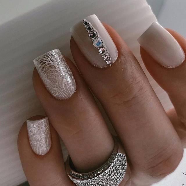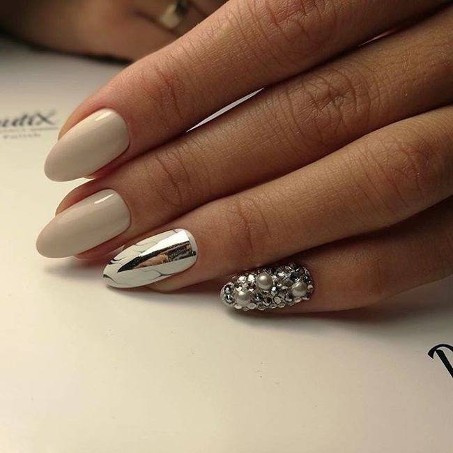 2. Имитацию материалов. В основном, в качестве украшений невесте служат ювелирные украшения из золота, платины, серебра, жемчуга или бриллиантов. В маникюре прекрасными аналогами данных материалов выступают золотой и серебряный песок, блестки, стразы, перламутровый лак. С ними Ваш образ станет бесподобным!