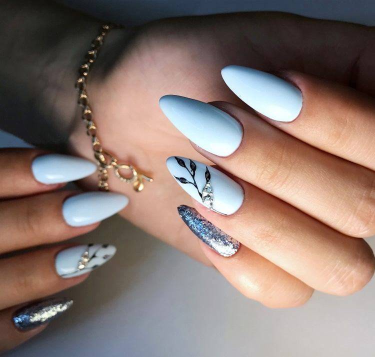 Голубой прекрасно сочетается с белым, нежно-желтым или розовым. Этот цвет часто используют в новогоднем варианте нейл арта.