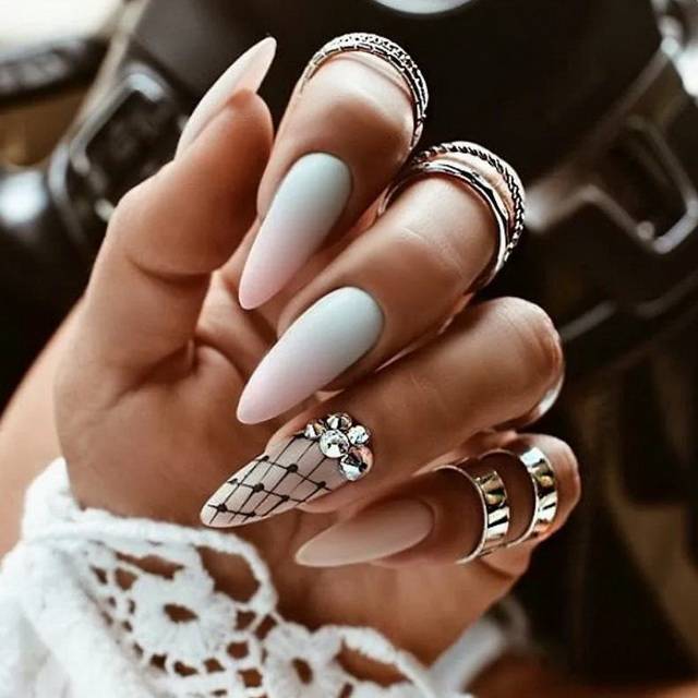 Современная невеста может позволить себе все – даже острые ногти-стилеты. Главное – не выбирать слишком яркие цвета для их дизайна, отдавая предпочтение легкому нюду с матовым финишем. Такие ногти будут смотреться еще нежнее, если использовать аквариумный эффект в пастельных оттенках, мраморную роспись по мокрой основе и немногочисленный декор в виде одиночных кристаллов на отдельных ногтях.
