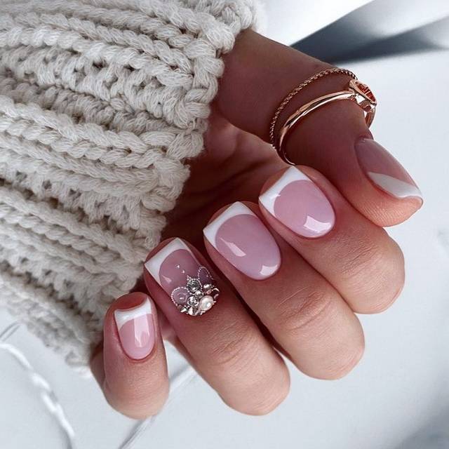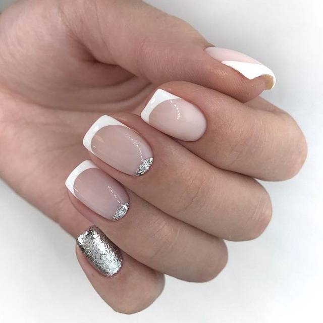 Французский маникюр станет идеальным решением для юных девушек, а также тех, кто предпочитает следовать классическим традициям и выбирает белоснежное романтичное платье. Такой вид маникюра подразумевает окрашивание ногтевой пластины в два цвета. Основание ногтя окрашивается в пастельный розовый или бежевый цвет, а его окончание – в белый. Желая придать ногтям праздничность, кончик ногтя можно украсить стразами или тонким кружевом.