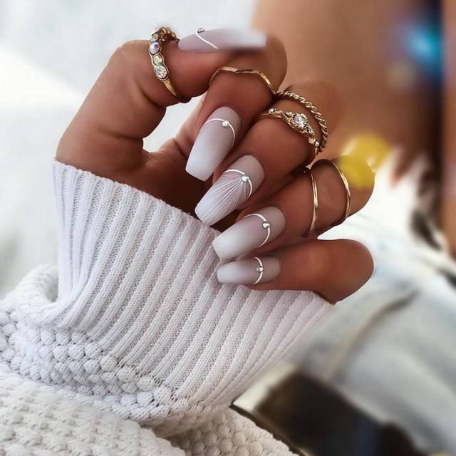 Так, считается, что внушительная длина уже является своего рода украшением, которое не нуждается в излишнем подчеркивании. Поэтому в идеале остановить свой выбор не только на самых нежных базовых оттенках, но и на едва заметном неброском декоре в виде сухоцветов, белых лунках, тонких серебристых и золотистых полосках, нюдовом шиммере, белой кружевной прорисовке и пр.