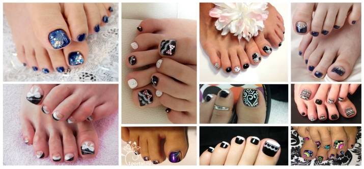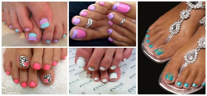 . При помощи такого педикюра девушка подчеркнет грациозность и изящность. Кроме того, мастера настаивают на применении естественных оттенков косметических средств, разбавляющихся с броскими тонами. Для этого кончики делают желтыми, бирюзовыми, голубыми, белыми, синими линиями.
