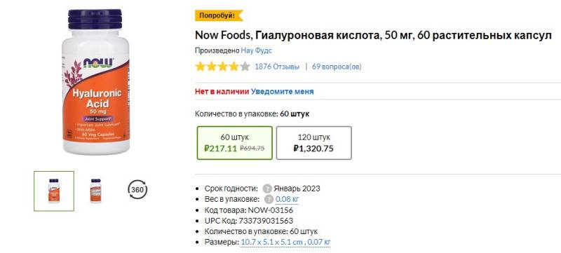 Данная гиалуроновая кислота в таблетках на АйХерб имеет высокую стоимость: цена за упаковку составляет 1500-2400 рублей.
