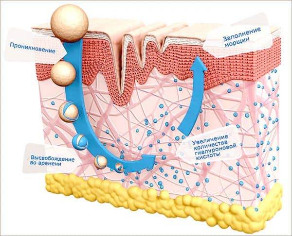 Действие гиалуроновой кислоты внутри кожного покрова.