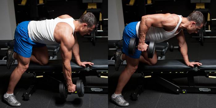 - Правую ногу поставить назад. Отодвигать можно настолько далеко, насколько того требует устойчивая позиция. Взять гантель в правую руку и выполнять тягу к поясу.