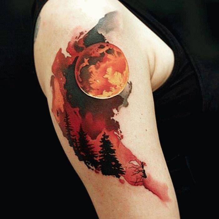 Пейзажи. Как удержаться и не набить прекрасную картину, изображающую дивный зеленый луг с яркими вкраплениями полевых цветов, или же кусочек прекрасного океана, словно оживающего на коже и разбрасывающего мелкие брызги воды вокруг, или далекий космический пейзаж с его расплывчатыми звездами и планетами, который будто вот-вот охватит все тело? Эти идеи очень сложно описать словами, но можно реализовать в акварельной технике, и поверьте, это будет невероятно красиво.