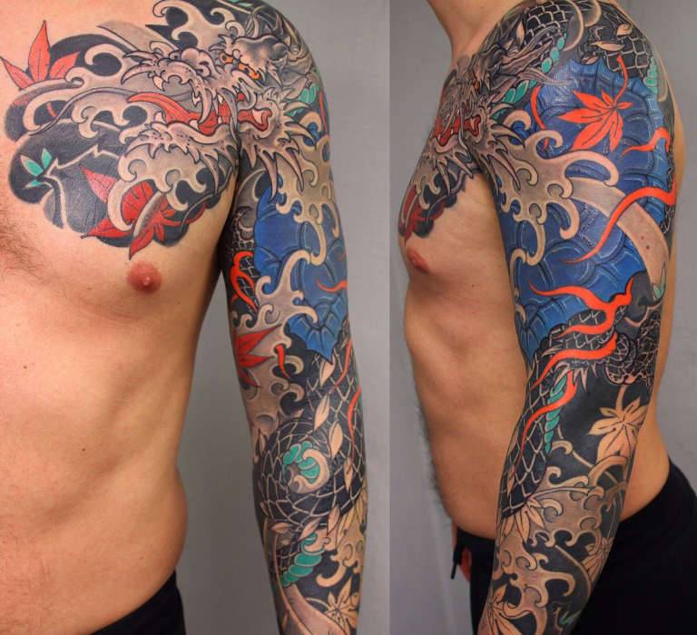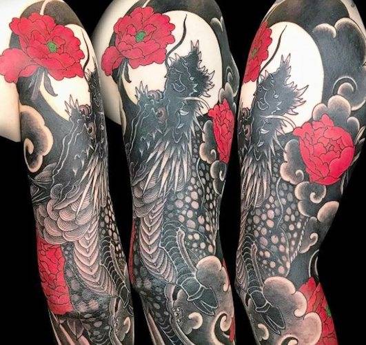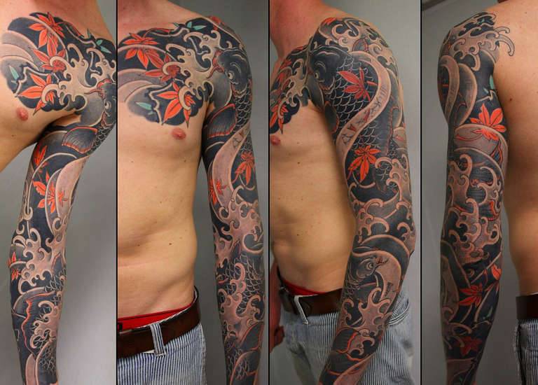 Рукав – самая удачная идея для японского стиля тату. Здесь можно не ограничиваться с размерами и масштабами тату, сочетать сразу несколько животных, персонажей, и узоры. Это целая художественная композиция, укрывающая всю руку, а также предусматривающая демонстративный характер.