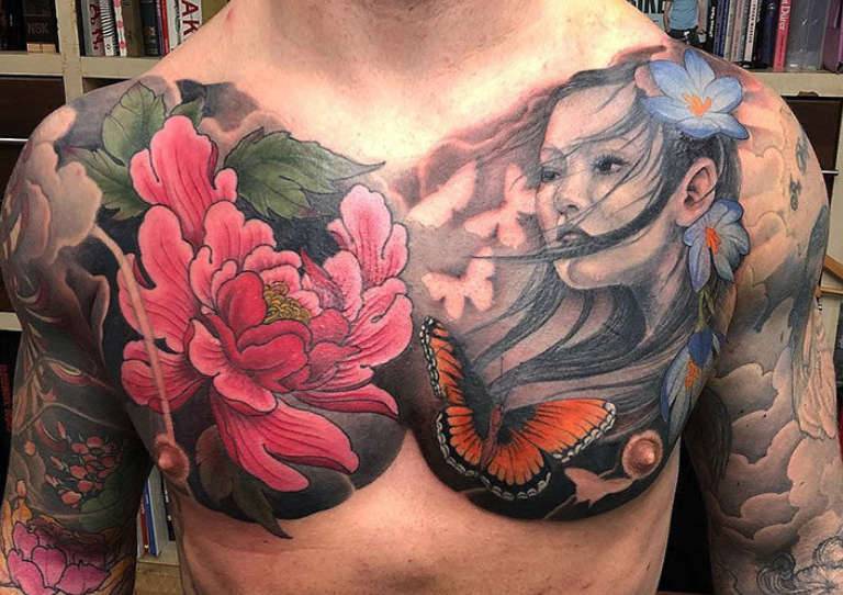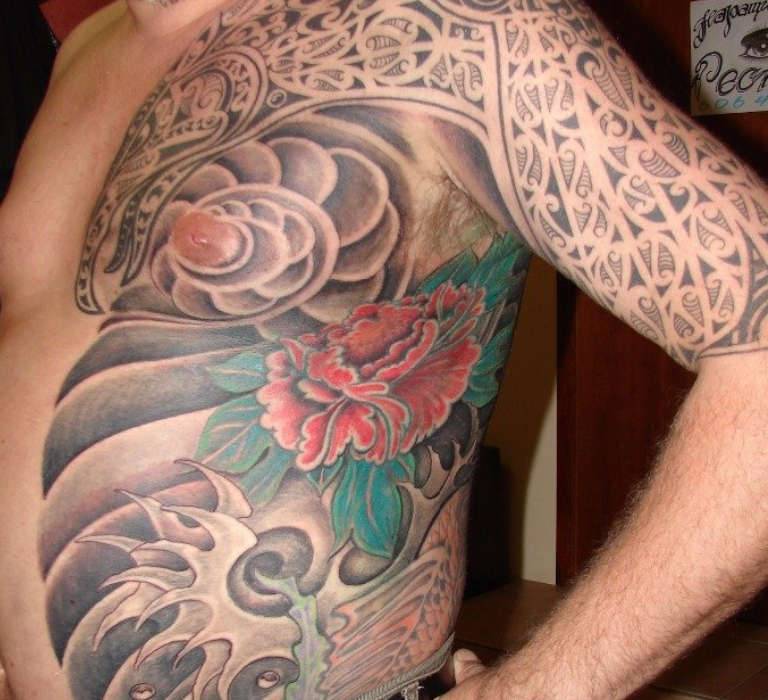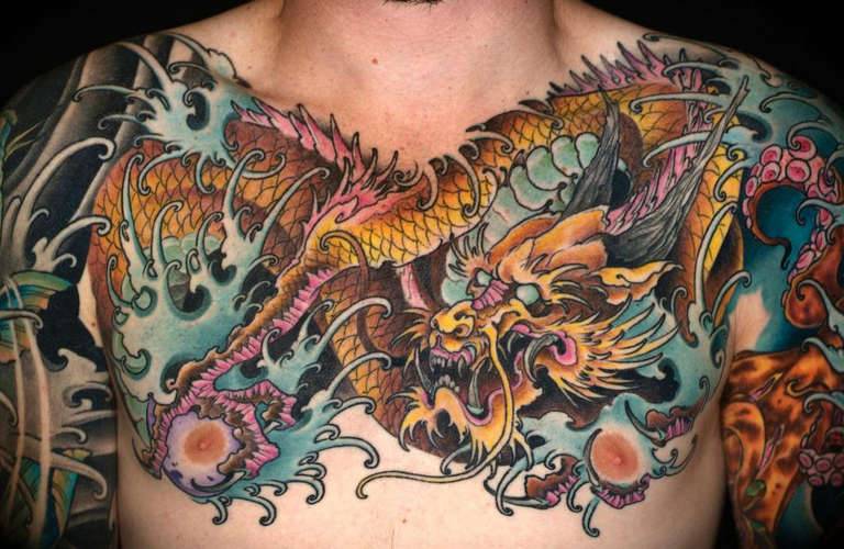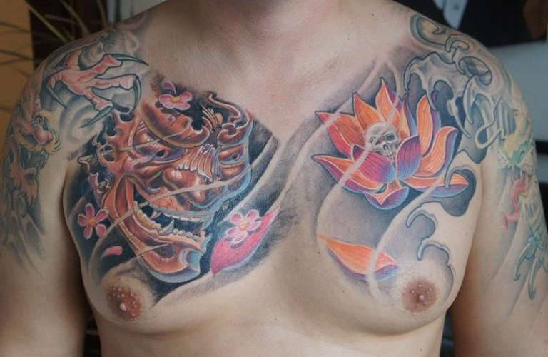 На груди принято бить татуировки, оберегающие от неудач и опасностей. Поэтому сюда можно нанести рисунок дракона, дракона и тигра, других персонажей, дополнив картину растительными элементами, надписями.