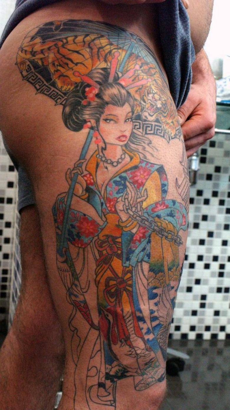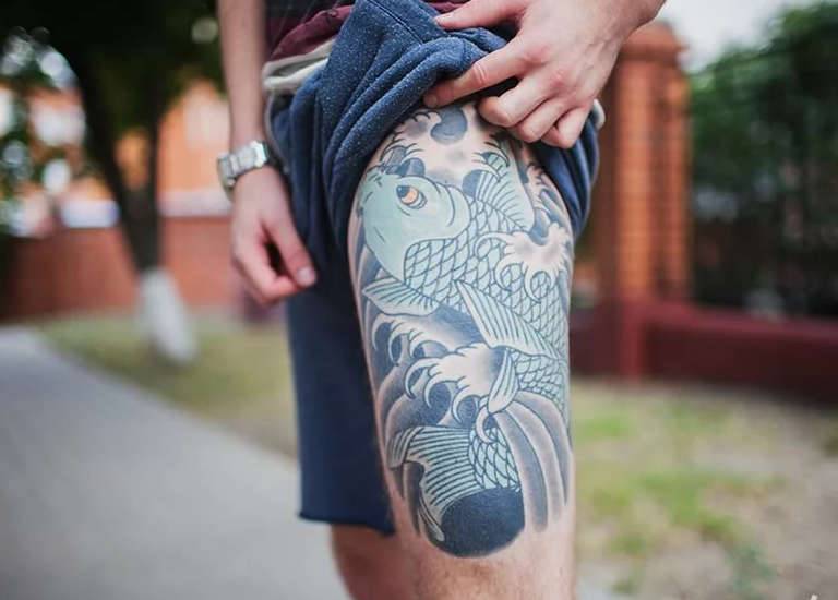 На бедре мужчины редко бьют татуировки, так как их смысл будет касаться личной и интимной составляющей жизни. Как вариант, сюда можно нанести рисунок карпов, как символ мужественности, пион, как знак мужского начала, дикого зверя, как олицетворение страсти и огненного нрава.