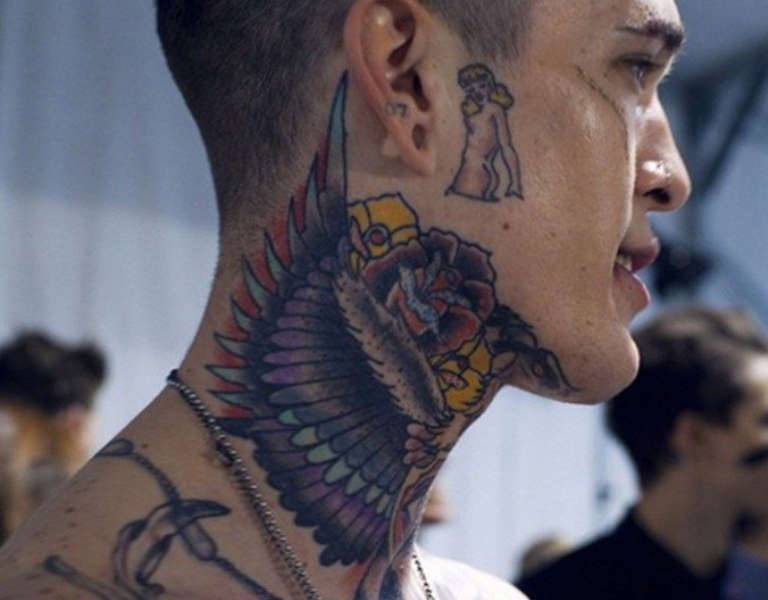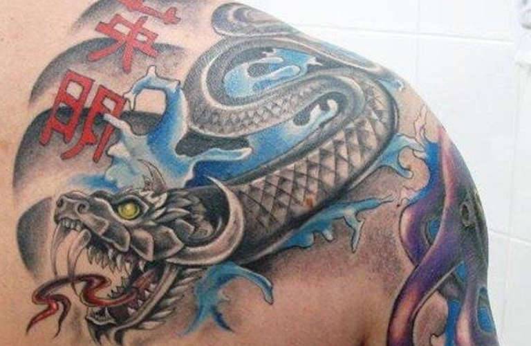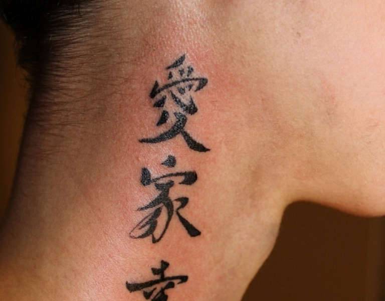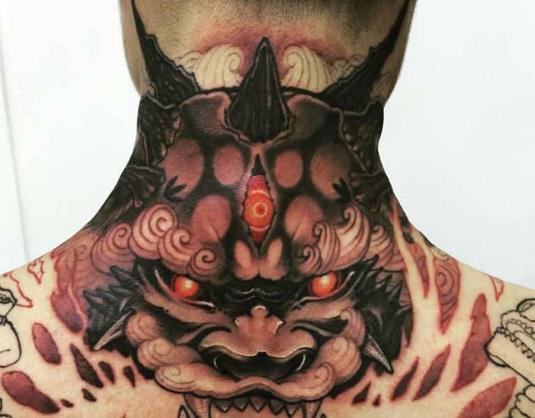 Нарисовать на шее дракона или самурая достаточно сложно, так как пространство крайне ограничено. Сюда обычно бьют надписи на японском языке, либо изображают только части животных – лапу, след, морду. Уместными будут только тату с глубоким сакральным значением.