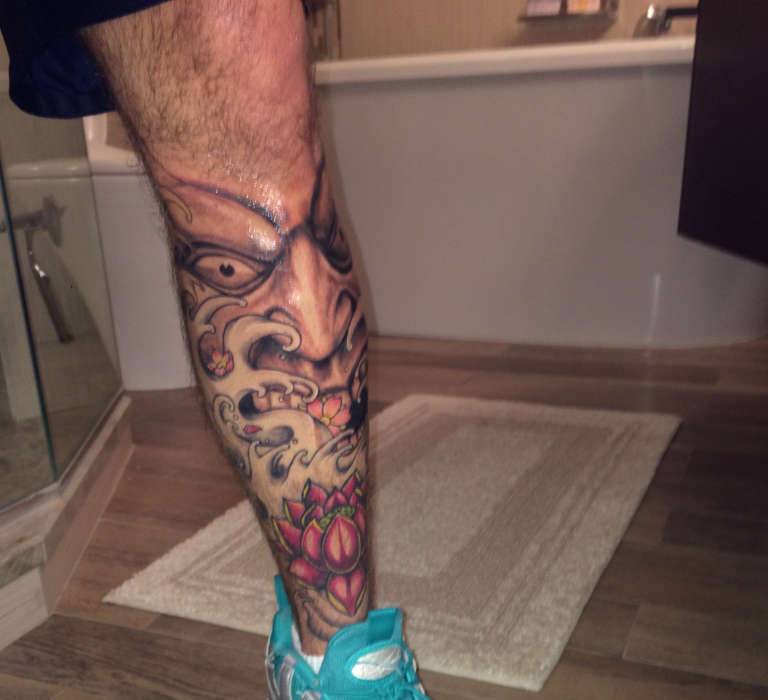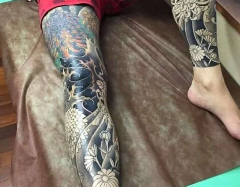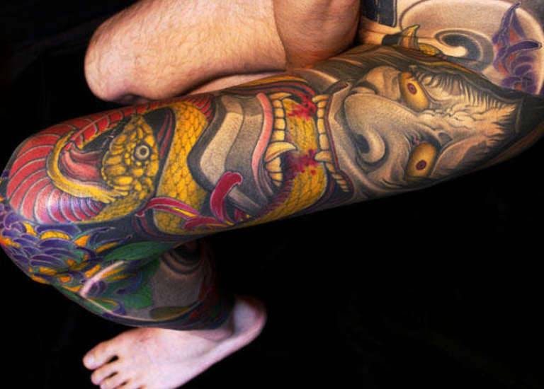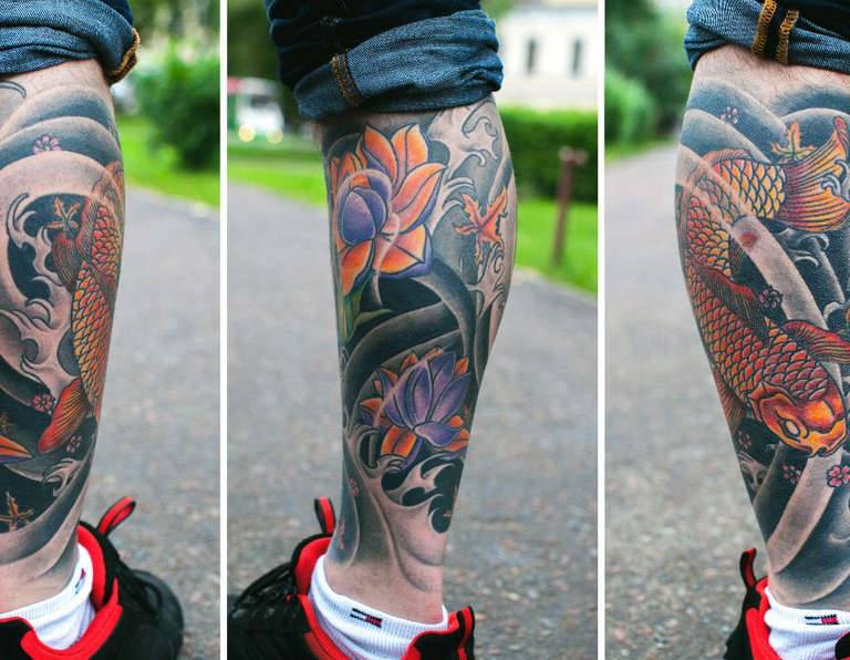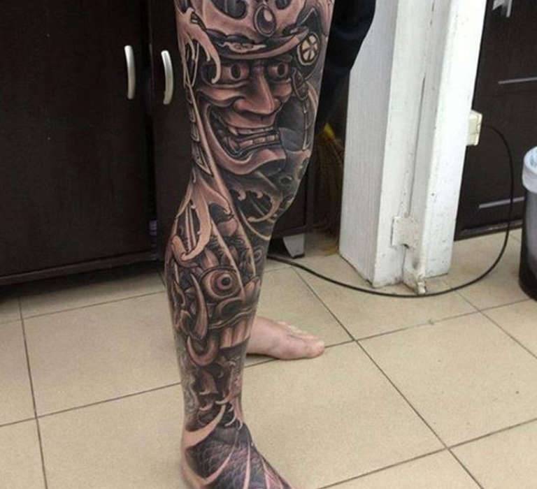 На ноге оригинально будет смотреться любое животное в японском стиле – дракон, тигр или змея. Нередко сюда наносят рисунки воинов, а композицию дополняют растительными элементами. Значение тату должно мотивировать мужчину на верные поступки и движение вперед.