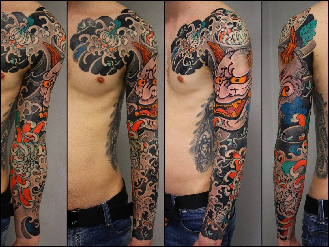 Рукав – самая удачная идея для японского стиля тату. Здесь можно не ограничиваться с размерами и масштабами тату, сочетать сразу несколько животных, персонажей, и узоры. Это целая художественная композиция, укрывающая всю руку, а также предусматривающая демонстративный характер.