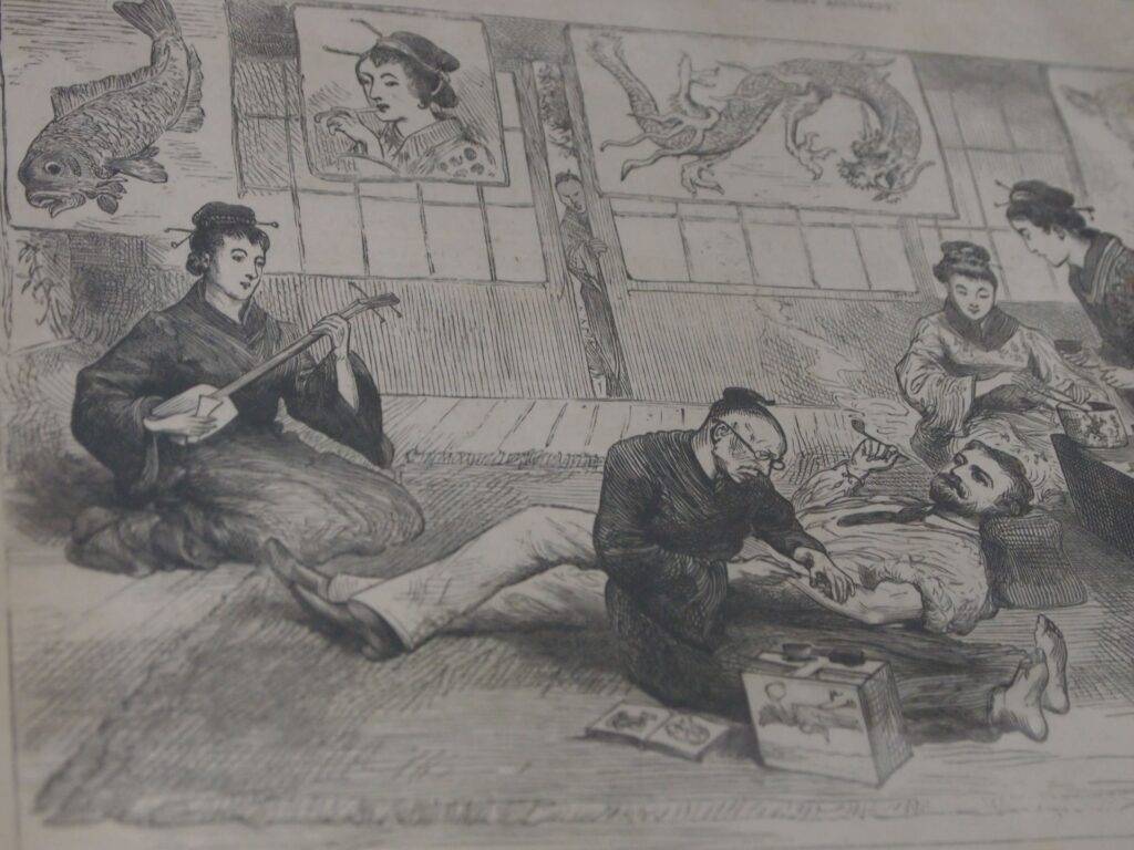 Изображение 1882 года из Illustrated London News показывает, как иностранец делает татуировку в Нагасаки. |