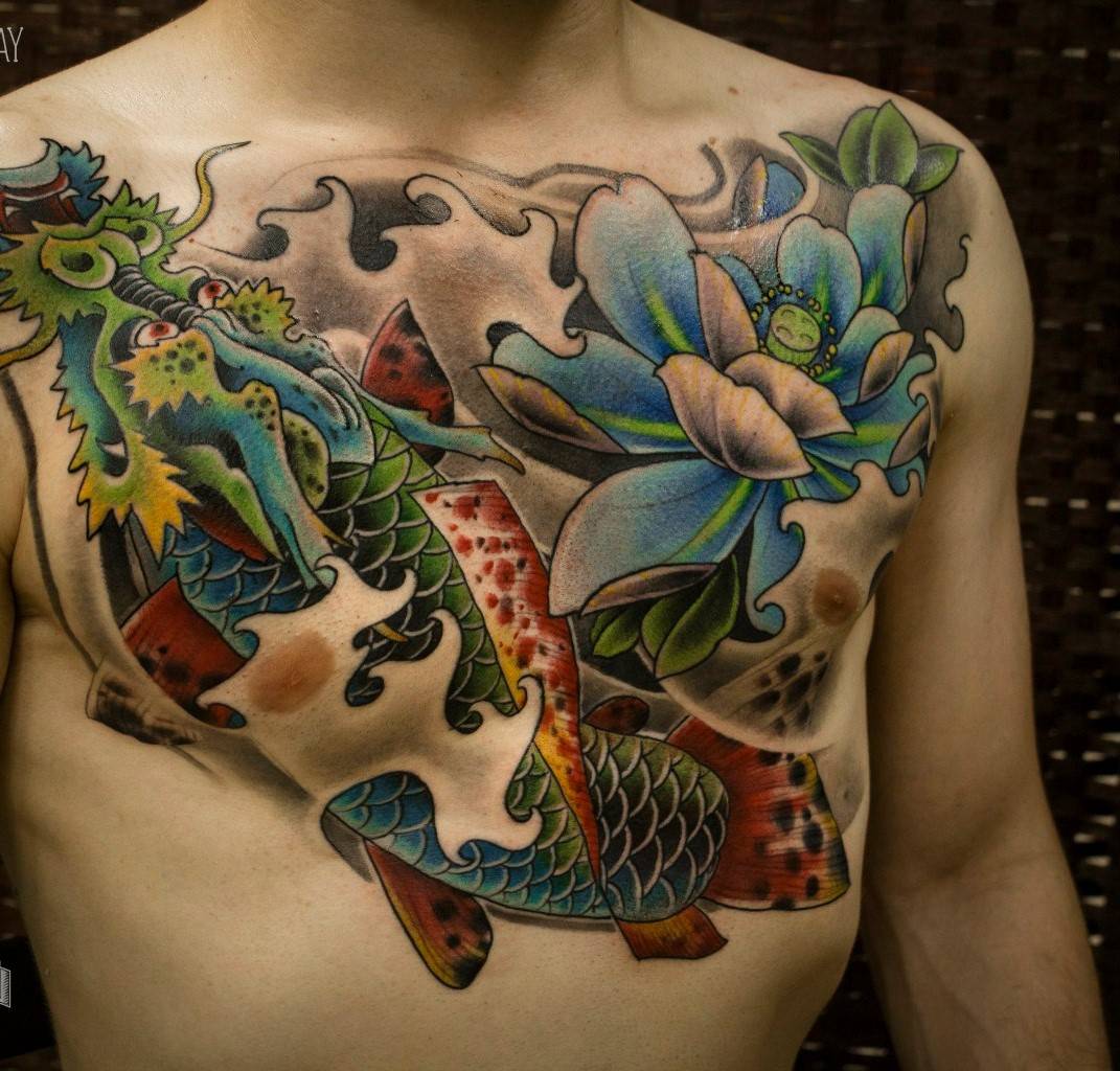 На груди принято бить татуировки, оберегающие от неудач и опасностей. Поэтому сюда можно нанести рисунок дракона, дракона и тигра, других персонажей, дополнив картину растительными элементами, надписями.