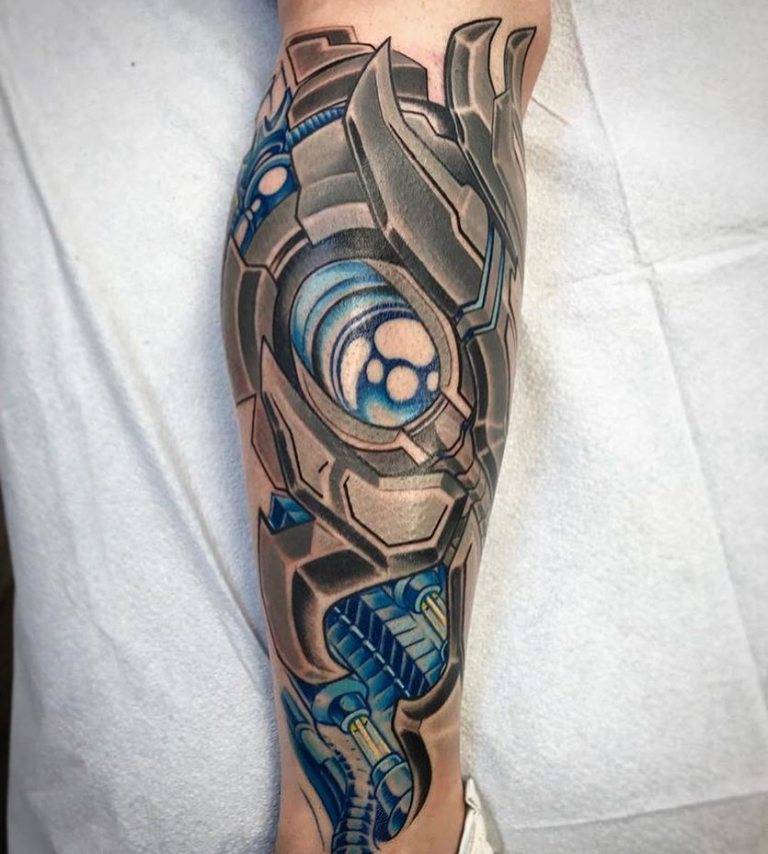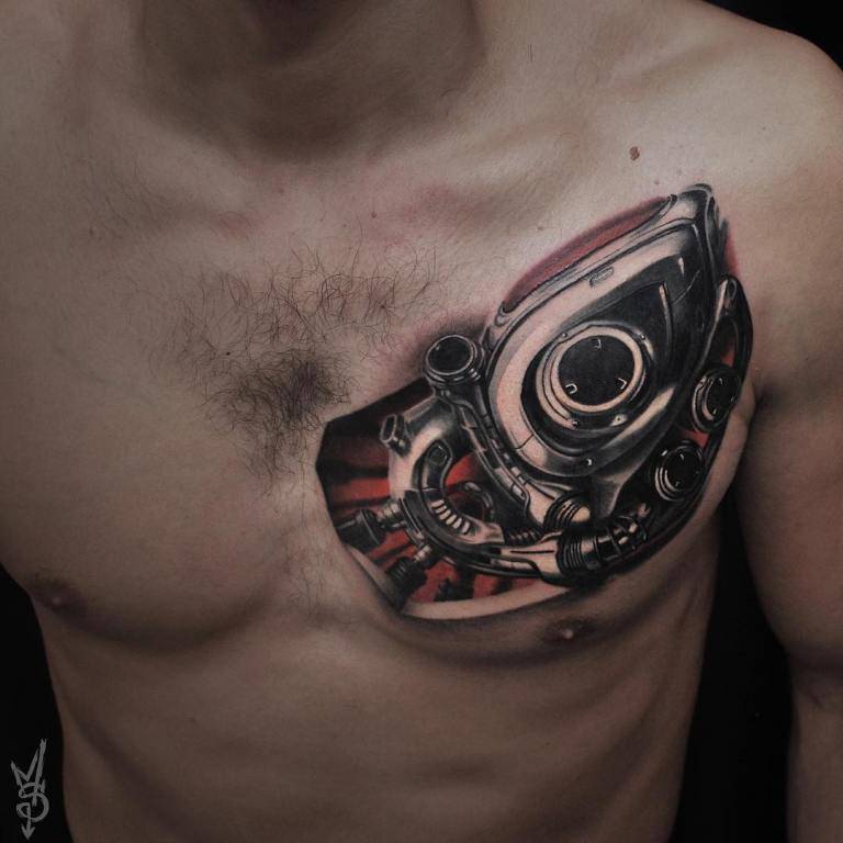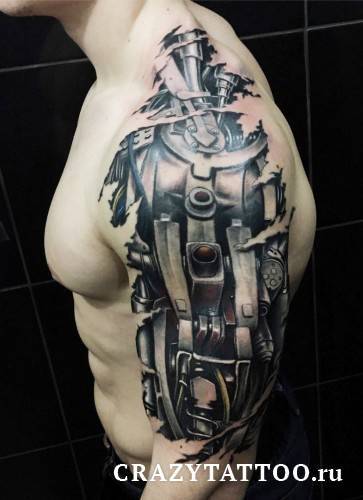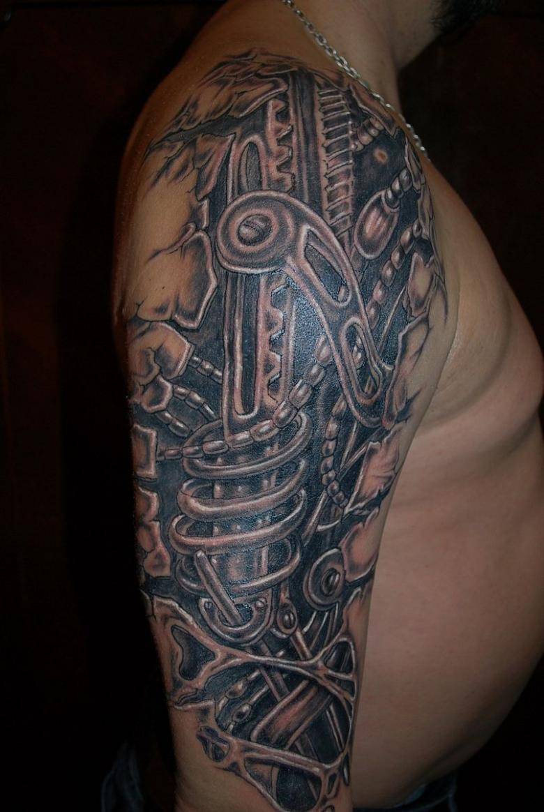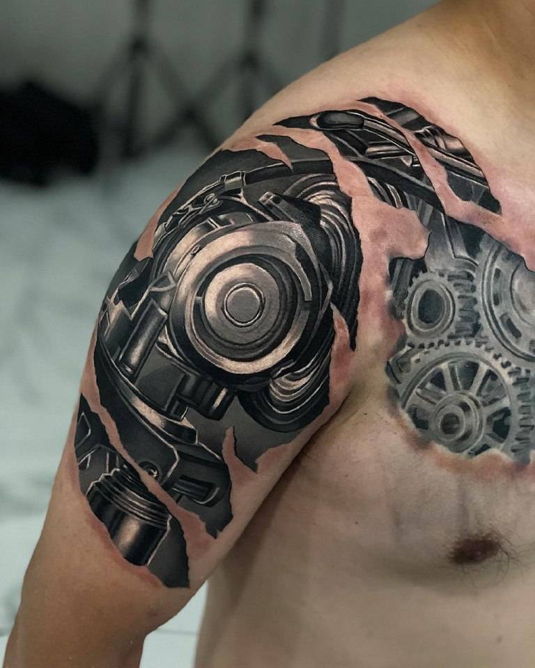 Мышцы плечевого сустав позволяют добавить изображению на теле объема. Чтобы создать трехмерное тату, мастер располагает главные запчасти и элементы на бицепсе, делая их реалистичными. Тату биомеханика на плече может переходить на грудь или лопатку. Тяга некоторых людей к кибермеханике превращает их тела в терминатора.
