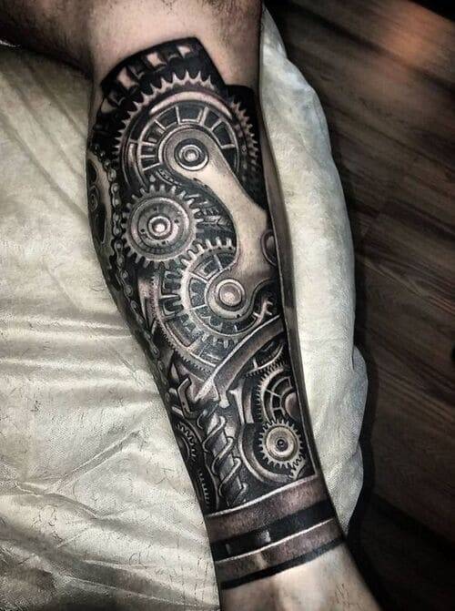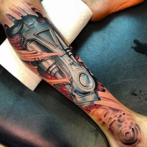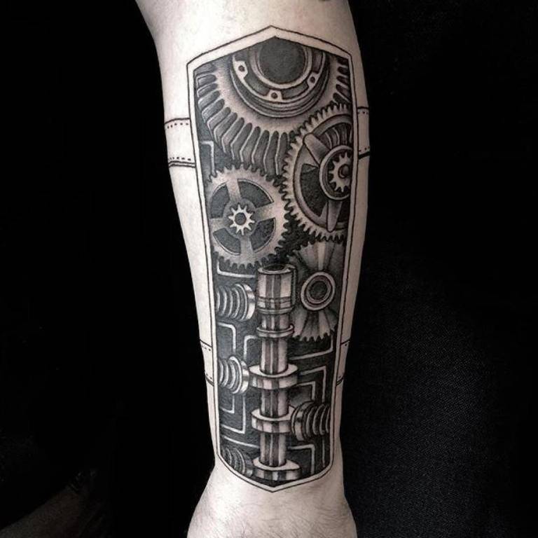 Хорошо выглядит татуировка биомеханики на плече и предплечье. Здесь можно изобразить мускулы с помощи металлических пластин, работу сложного механизма. Рисунок можно продлить к груди, лопаткам и к кисти или же задействовать пальцы. На мускулистом теле хорошо смотрятся большие и объемные детали, широкие ремни и пластины, рычаги и пружины, каркасы и рессоры.