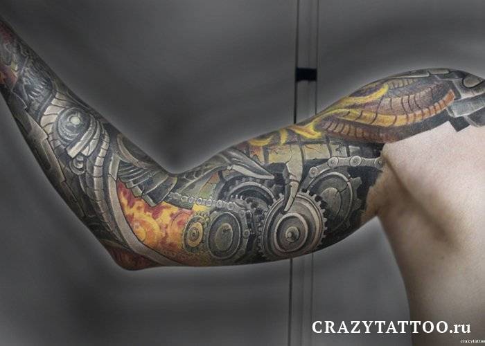 Тату рукав биомеханика — один из самых популярных вариантов. Перетекающие одна в другую детали механических элементов можно закрутить вокруг бицепса или запястья.