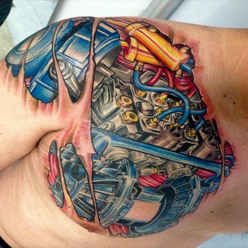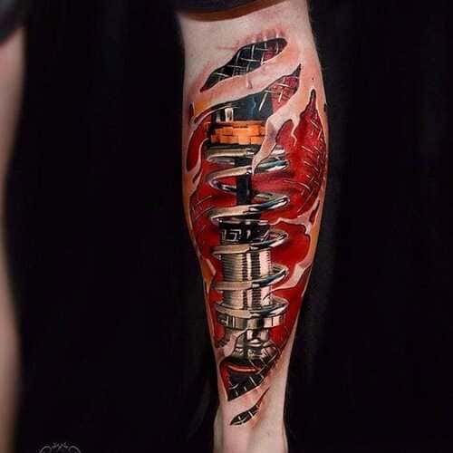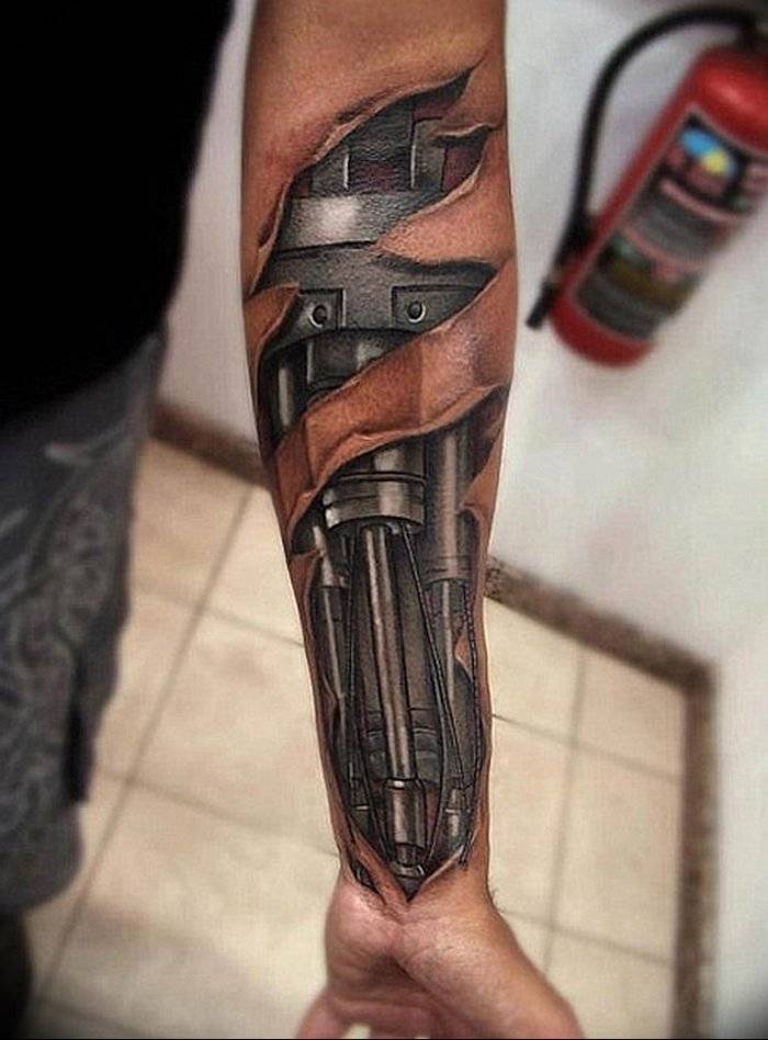 На протяжении многих лет тату пользуются популярностью среди всех возрастов. Не исключением среди них является один из эффектных и красивых стилей – биомеханика. Основной образ таких татуировок заключается в стилизации человека, а именно его частей, под всевозможные механизмы. Татуировка имитирует разрыв кожи из-за которого проглядываются механические составляющие человека. Биомеханика человека всегда зрелищна, а порой выполнена настолько хорошо, что кажется реалистичной на все сто.
