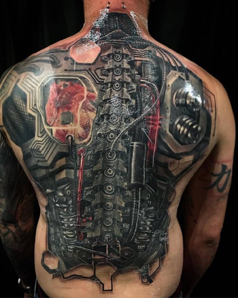 Удачным считается расположение на спине. На большой площади кожного покрова можно воплотить в жизнь самые смелые решения, нанося различные механические детали, придающие еще большую эффектность рисунку.