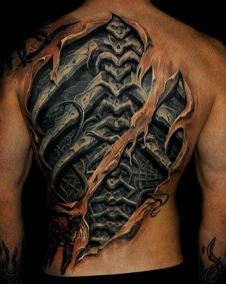 Часто наносятся изображения монстров, как бы разрывающих кожный покров и готовых вырваться наружу. Благодаря игре красок, такие наколки получаются очень эффектными и яркими.
