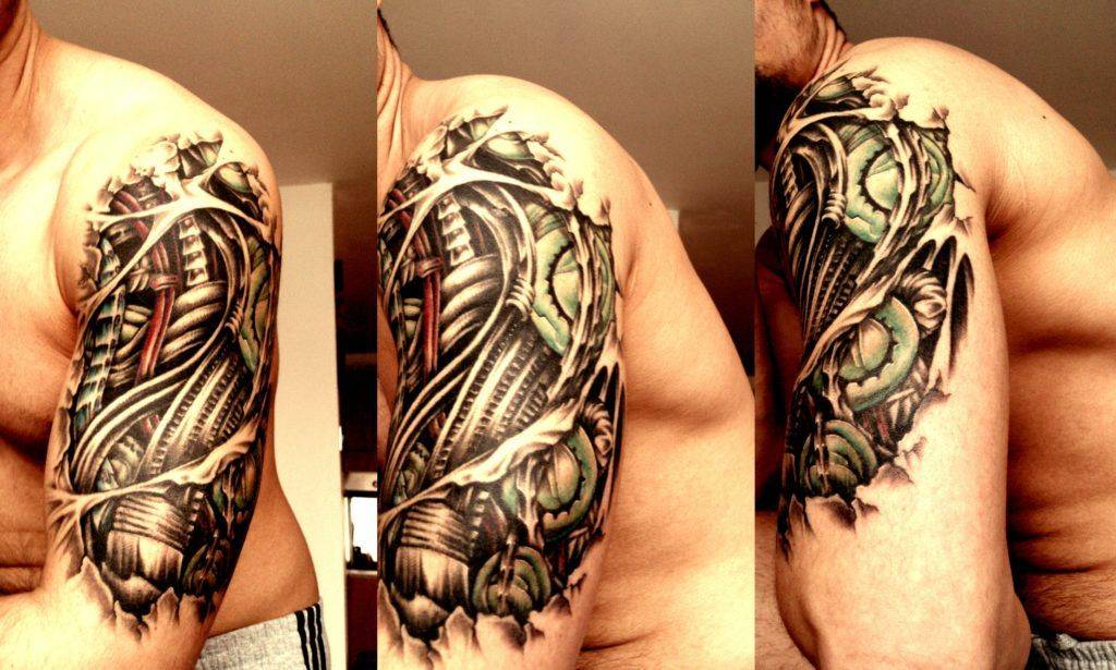 Мышцы плечевого сустав позволяют добавить изображению на теле объема. Чтобы создать трехмерное тату, мастер располагает главные запчасти и элементы на бицепсе, делая их реалистичными. Тату биомеханика на плече может переходить на грудь или лопатку. Тяга некоторых людей к кибермеханике превращает их тела в терминатора.