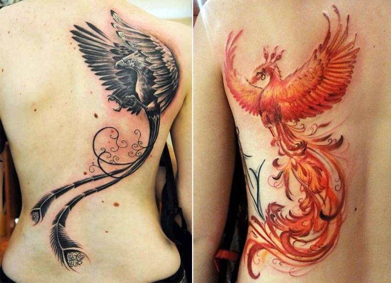 - феникс на спине – только что упомянутый нами. Масштабный рисунок, часто на сложном фоне, с дополнительными деталями. Спина – самый большой, и достаточно удобный участок человеческого тела. Здесь у татуировщика будет достаточно пространства для создания настоящей картины;