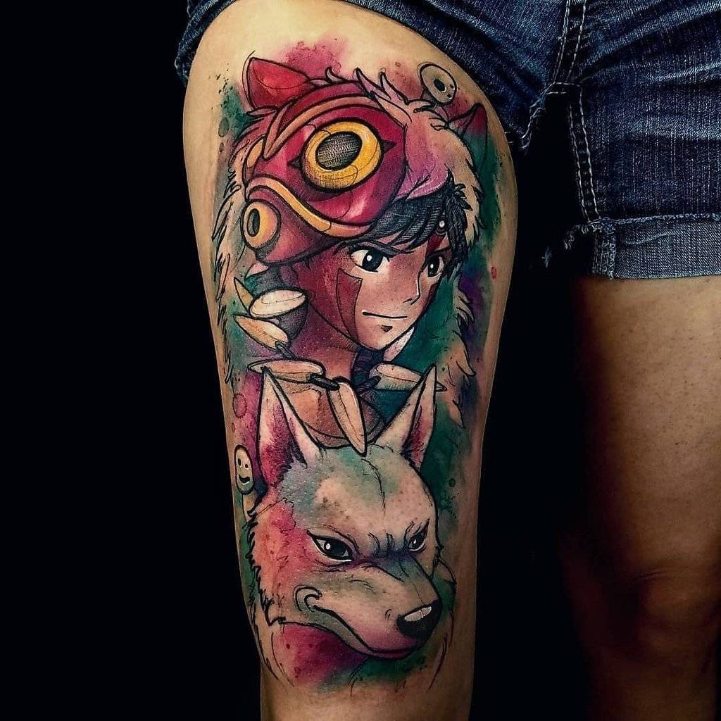 Картина «Мой сосед Тоторо» подарила любителям аниме большое и милое существо – хранителя леса, всевозможные изображения которого активно используются в оформлении тату. Очень эффектно может выглядеть в эскизах девушка из индейского племени со своим ручным волком, с которой нас познакомила работа Миядзаки «Принцесса Мононоке».