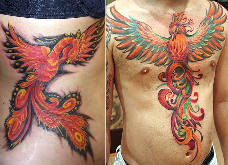 - Девушки и молодые парни нередко заказывают татуировку с огненной птицей на боку.