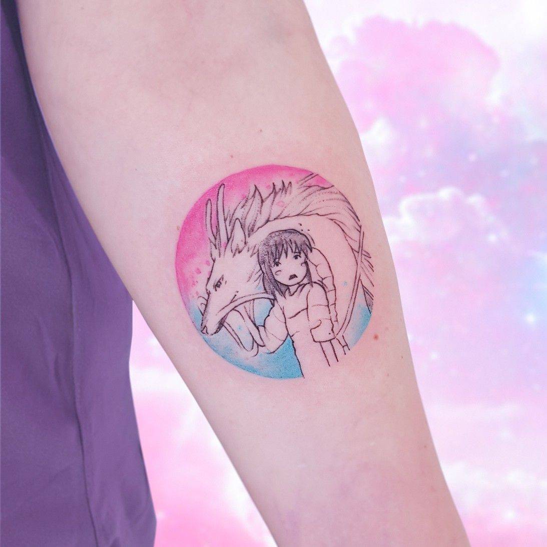 Очень распространены в татуировках главные герои мультфильма «Унесённые призраками» — Тихиро и Хаку, зачастую изображающиеся вместе. Хаку в обличии мифического существа – дракона, выглядит особенно впечатляюще. Не редко в эскизах используются образы второстепенных героев, к которым относятся безликий и Юбаба.