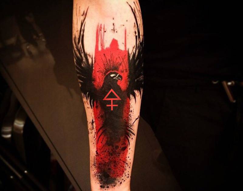 Татуировка феникса знак алхимиков обозначающий серу, стиль треш-полька