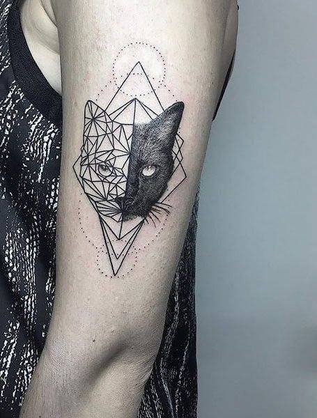 Геометрический стиль татуировки невероятно привлекателен, потому что он выглядит простым, но в то же время сложным. Хотя некоторые люди предпочитают сосредотачиваться только на линиях и формах, другие любят включать различные изображения, например животных, и что может быть лучше, чем кошка? Кошачьи ассоциируются с удачей, тайной, скрытностью, а иногда даже со смертью. Существует широкий выбор дизайнов, так что вы действительно можете сделать свои чернила уникальными для вас. Выбирая татуировку, не бойтесь выбрать большой кусок и с гордостью разместите его на предплечье или бедре.