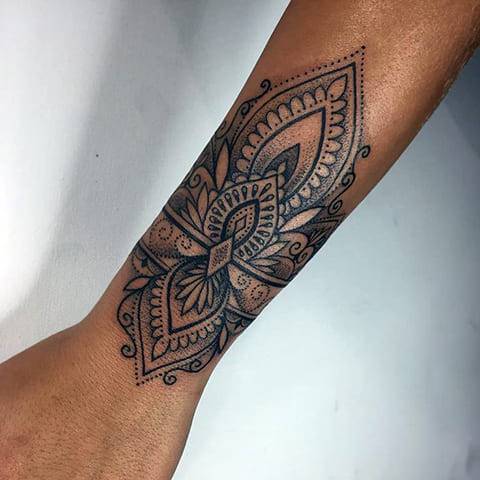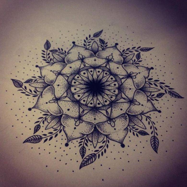 - Для счастья. Такая мандала в виде татуировки изображается с листьями, лепестками, узорами округлой формы. Посыл, который излучает символ, направлен на сокращение внутреннего негатива и плохих мыслей человека.