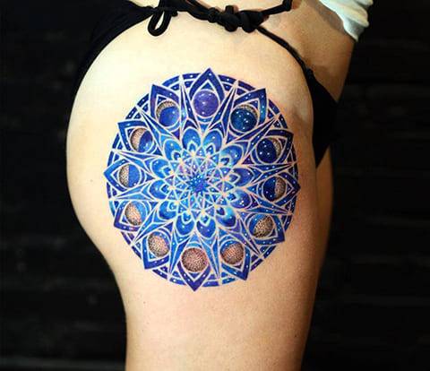 Так как символ обладает сакральным смыслом и является оберегом, то и место на теле для татуировки должно быть подходящим. Несмотря на то, что нательный рисунок будет отлично смотреться практически на всех участках тела, многие выбирают именно определенные места. Чаще всего мандалу наносят на спине между лопатками, на запястье, на пояснице, под грудью, на бедрах. Редко встречается на ногах, и очень часто на руках.