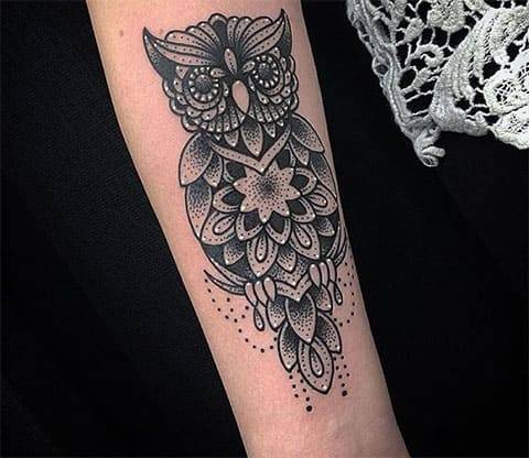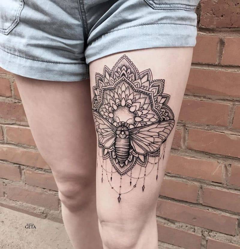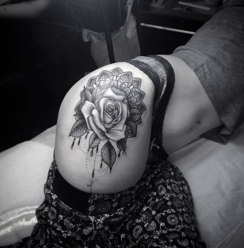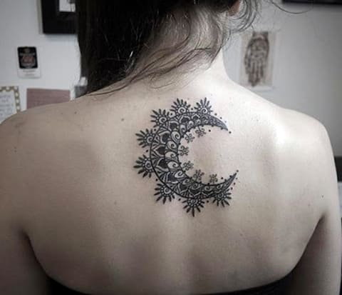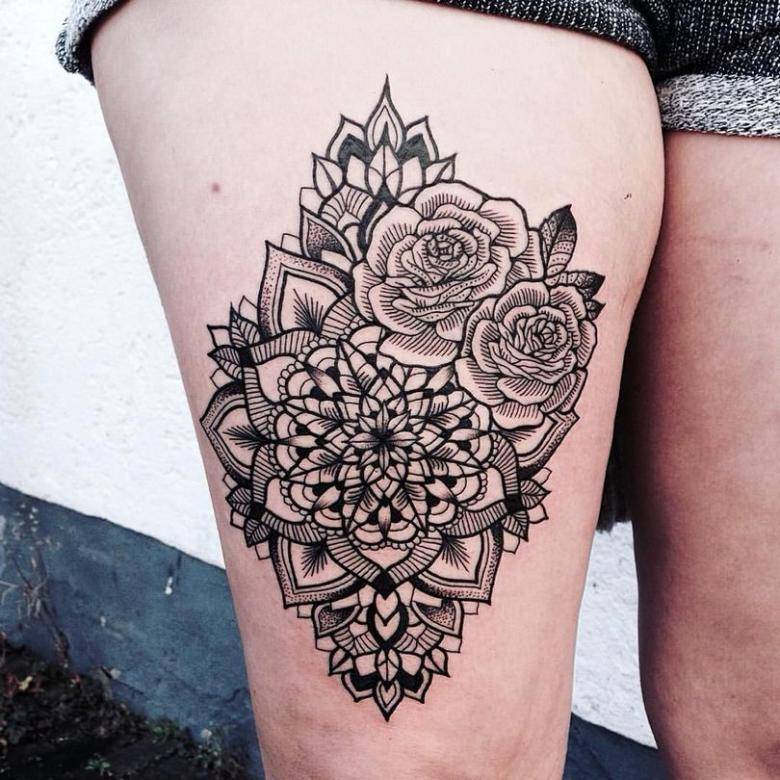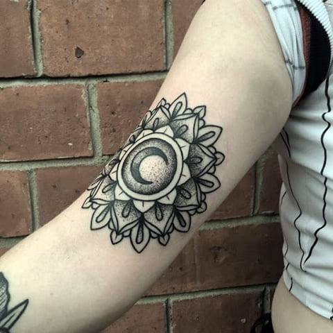 Часто можно увидеть комбинированные рисунки, сочетающие классику и более современные мотивы, и даже фэнтези. К примеру, у девушек пользуется успехом тату с луной в стиле мандала.