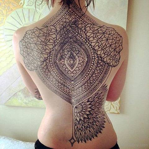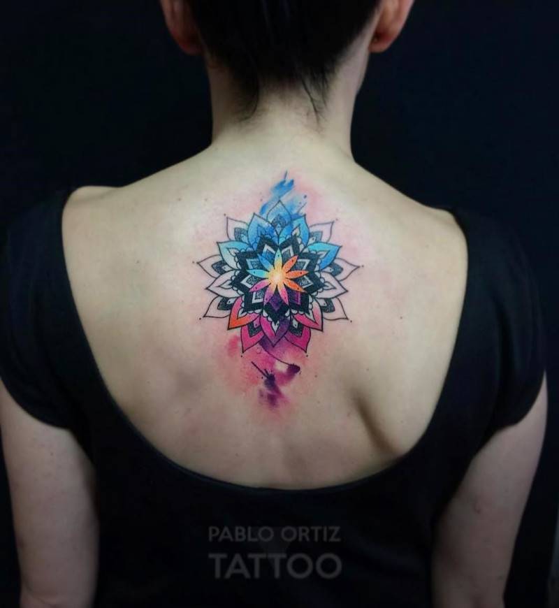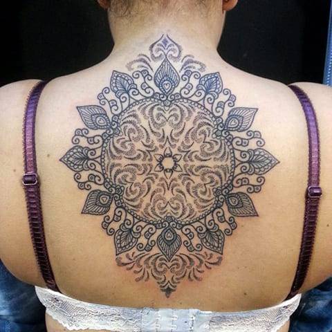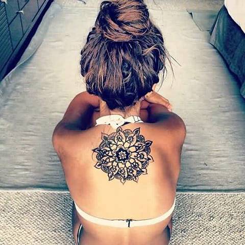 Также красиво будет смотреться мандала на спине девушки. Однако стоит подумать о том, где именно будет размещен центр рисунка. Специалисты рекомендуют внимательно изучить схемы расположения основных энергетических центров на теле человека. К примеру, на спине только основных (чакр) три. Это 2, 3, и 4-я чакры. То есть, области, начиная с пояснично – крестцового отдела, и заканчивая грудной клеткой. Небольшие центры есть и на других участках человеческого тела.