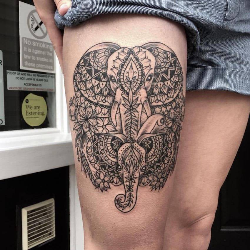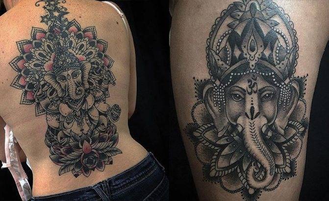 Бывают и более оригинальные рисунки, в которых, порой, сложно разобраться. К примеру, что означает татуировка слон с мандалой? Животное обычно символизирует индийского бога Ганешу. Этот персонаж мифологии – один из самых добрых и позитивных.