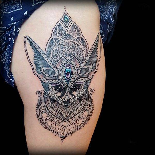 Подобное нательное изображение особенно эффектно выглядит в стиле тату графика и тату дотворк. Встречаются и цветные мандала тату. Учитывая, что каждый треугольник, который выделяется во внутреннем квадрате изображения, направлен на определенную часть света, то вполне логично, что у них свой цвет: