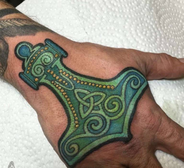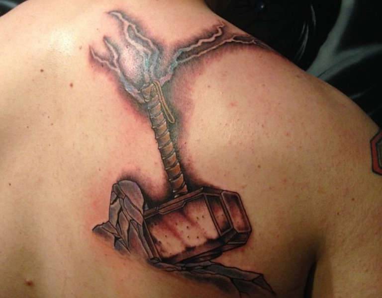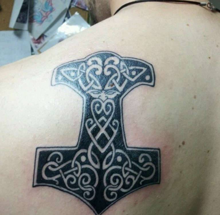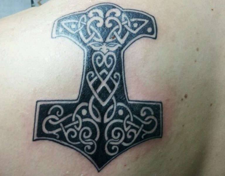 Молот Тора – татуировка такого формата станет сильным талисманом, так как обладатель будет под покровительством сына Одина Тора. Дословно тату означает разрушение и созидание, потому что молот способный как убить, так и воскресить.