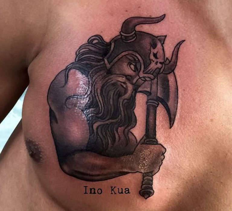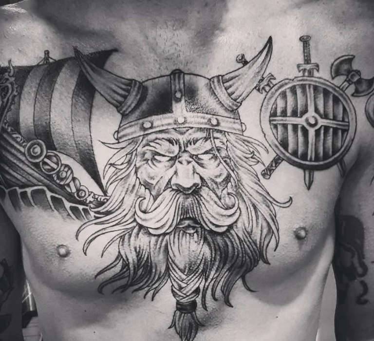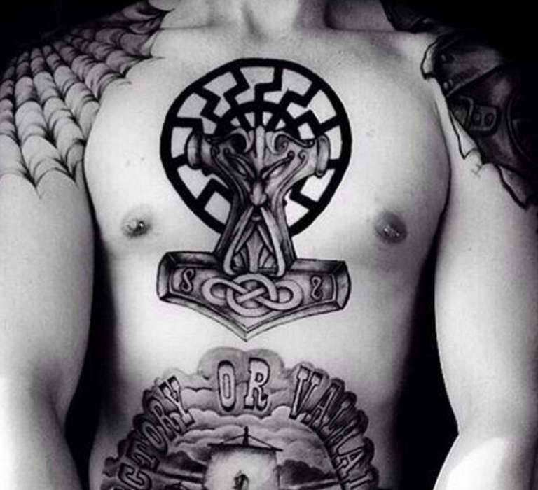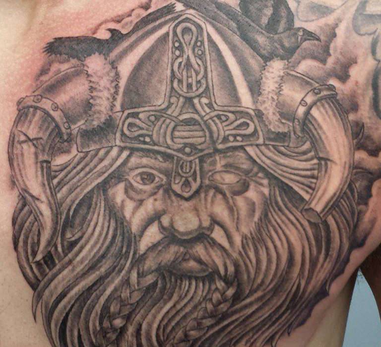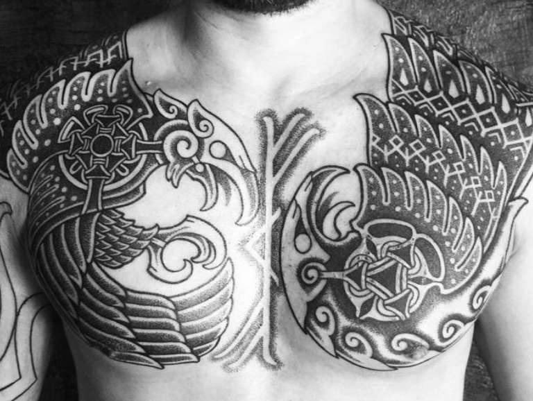 На груди эстетически привлекательно и мужественно будут смотреться художественные рисунки – вороны, дикие звери, популярные персонажи и божества из скандинавской мифологии.