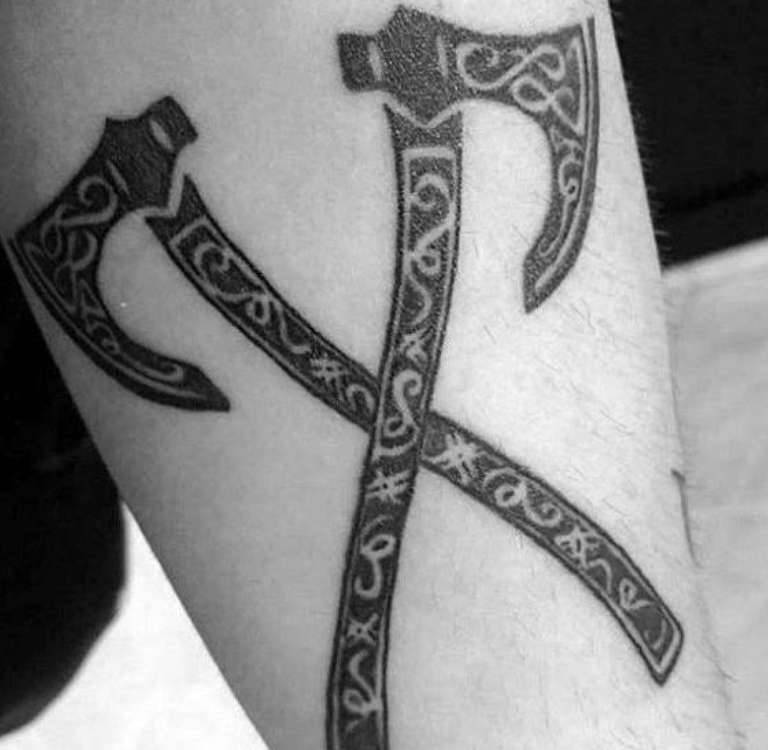 Два перекрещенных топора – символ власти и силы, созидание и защищенность от врагов, желание обустроить дом и завести семью. Татуировка станет показателем надежность партнера для жизни.