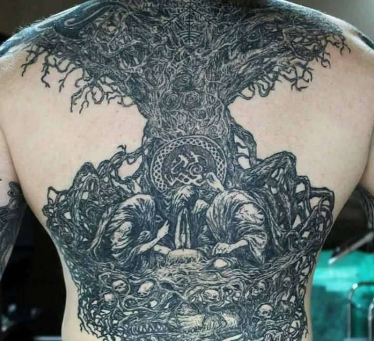 Спина – самый просторный холст для татуировок, обычно сюда наносят крупные эскизы и целые композиции. Здесь уместны боги, воины, дикие звери и птицы, а усилить смысл и работу татуировки могут руны и древние надписи.