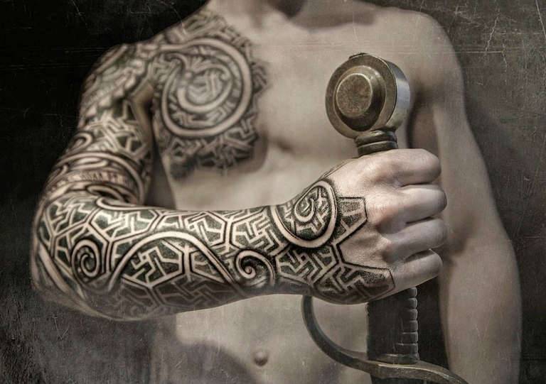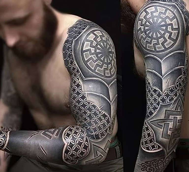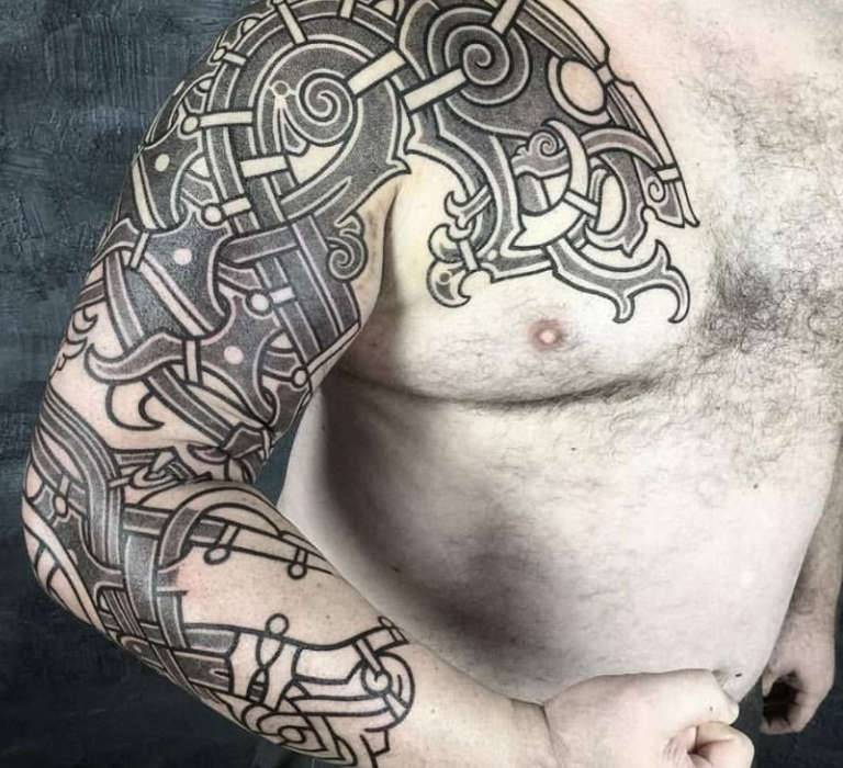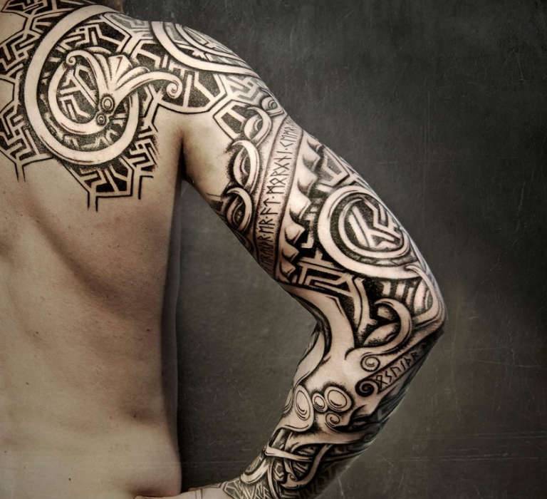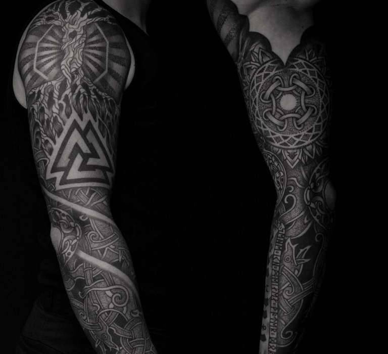 Рукав – это тату на руке, полностью ее перекрывающая своим эскизом. Рукав чаще всего выступает сложной композицией, состоящей из сочетания рун и орнаментов. К ним добавляют лица богов, разных мифических персонажей.