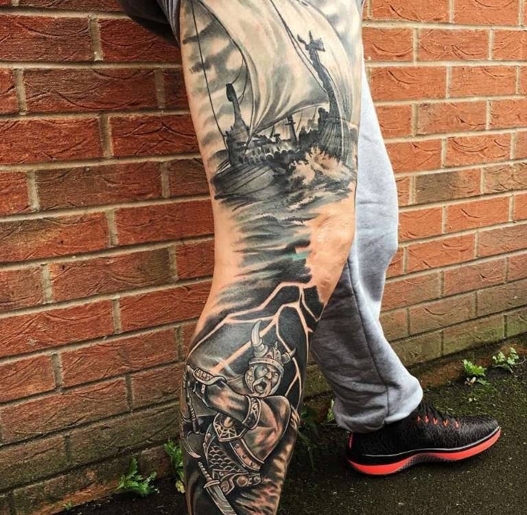 На ногах принято набивать скандинавские татуировки в формате узоров и орнаментов, популярны сегодня рунические вязи, сложные орнаменты из нескольких узоров сразу. Также некоторые мужчины полностью перекрывают ноги рисунками с кораблями, сражениями и божествами северных народов.