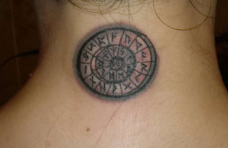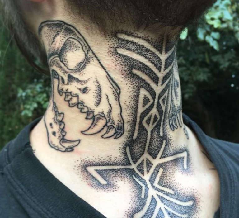 На шее уместны маленькие татуировки с глубоким сакральным смыслом. Желательно выбирать руны, надписи, узоры, выступающие в роли оберегом и талисманов, так как они работают сильнее, если располагаются рядом с головой.