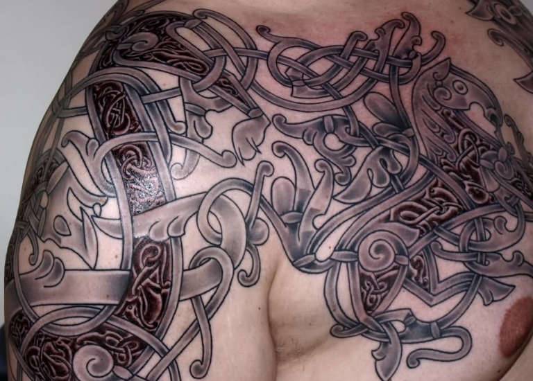 Место расположения татуировки также предусматривает глубокий смысл и особую интерпретацию нательного рисунка. Скандинавские мотивы обычно предполагают сложные и крупные эскизы на всю руку, спину, грудь, также это могут быть умеренные эскизы на укромных местах.