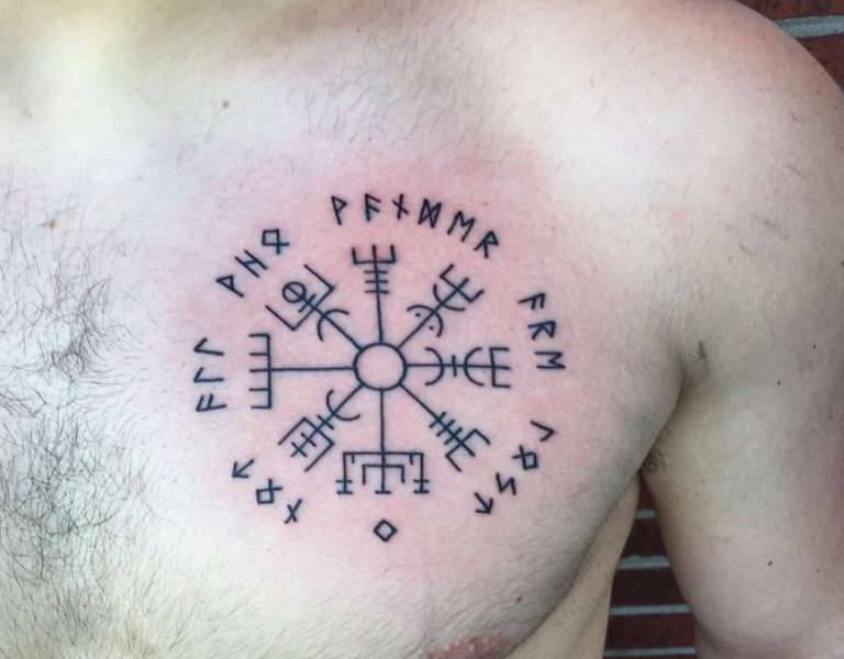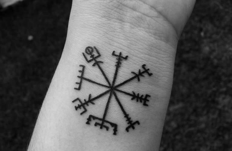 Рунический компас – древний символ, помогающий не сбиваться с пути. Сегодня такая татуировка также помогает принимать верные решения и двигаться в нужном направлении.